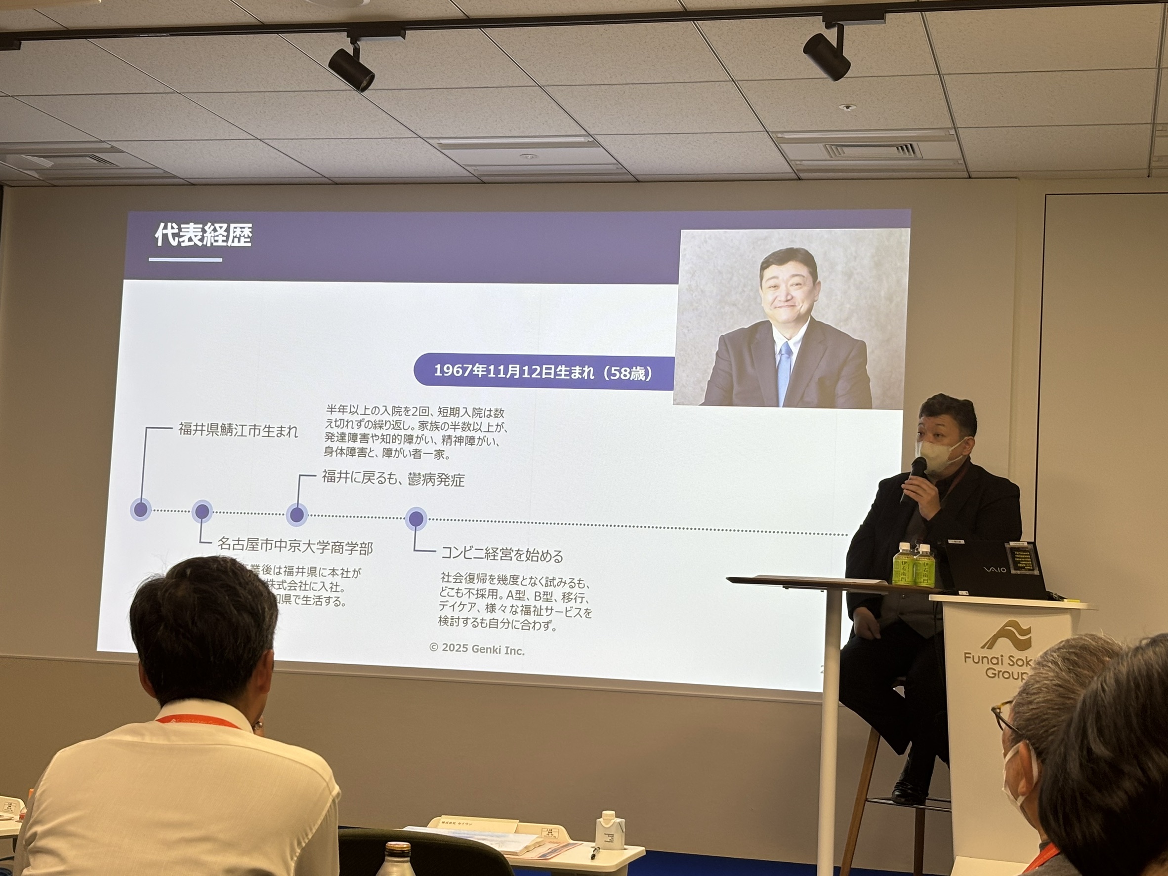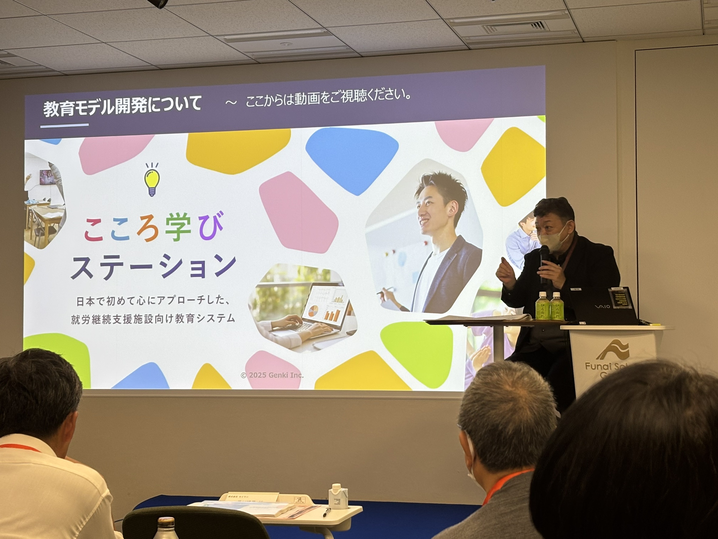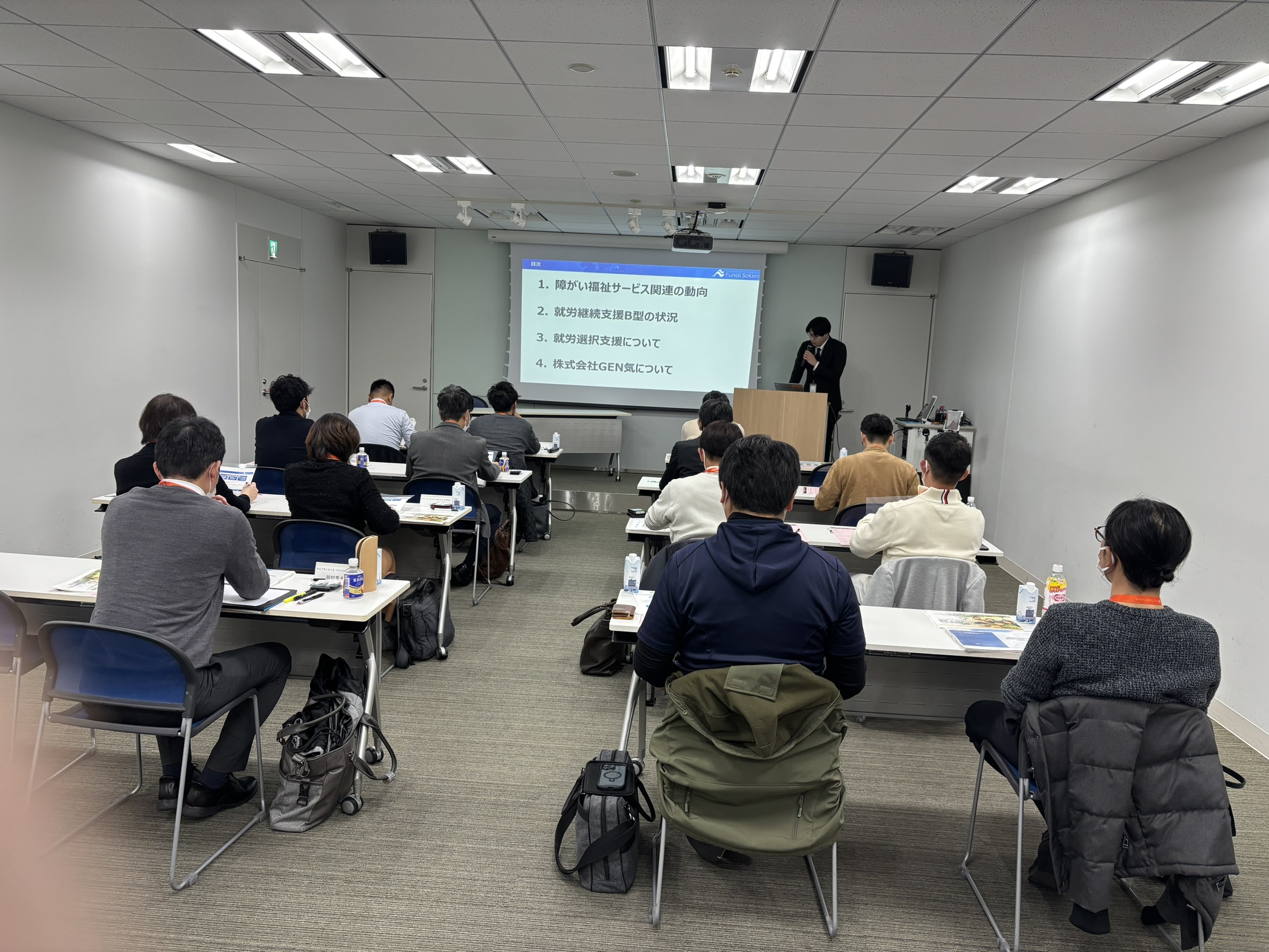 株式会社船井総合研究所様にて講演登壇のご報告 2025.12.06 最新情報 記事のタイトルとURLをコピーする 弊社代表・下村が、株式会社船井総合研究所様にて講演をさせていただきました。【東京会場】2025年11月17日 東京本社様【大阪会場】2025年11月26日 大阪本社様このような貴重な機会をいただきましたこと、心より御礼申し上げます。ご関係者の皆様に、あらためて感謝申し上げます。 ■講演会タイトル 就労継続支援B型の安定運営から一般就労創出の仕掛け。 新規事業展開について。■講演会概要 就労継続支援B型事業所が今始めるべき一般就労の創出。 IT・教育・訓練と一般企業との橋渡し。 GEN気グループが創る就労モデルや新規事業をお伝えいたしました。 画像をクリックしていただくと、拡大表示され、スライドで順番にご覧いただけます。 ご報告:特別顧問高市拓への叙勲について 前の記事 【開催報告】櫻庭露樹様 講演会 in 東温市中央公民館 次の記事