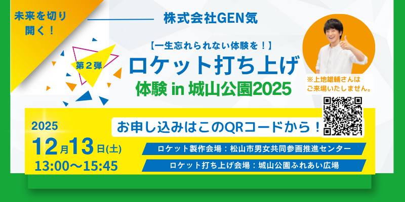 ロケット打ち上げ体験のお申込みはこちらから! ロケット打ち上げ体験 in 城山公園2025 の詳細はこちらから! ロケット打ち上げプロジェクトロケット製作・発射体験会ロケット打ち上げ体験GEN気は、「下町ロケット」のモデルとなった『植松電機』様のロケット体験開催のパートナーです。 「夢をあきらめない力」を子どもたちへ 植松電機様「ロケット教室」開催について このたびGEN気は、株式会社植松電機様の「ロケット教室」を開催できる「UEパートナー」となりました。植松電機様は、テレビドラマ『下町ロケット』のモデルにもなった企業であり、「思い描くことができれば、それは実現できる。」「思うは招く。夢があればなんでもできる。」という信念のもと、北海道赤平市で小型ロケットの開発・製造に取り組まれています。 「ロケット教室」は、そんな植松電機様の想いをカタチにした体験型プログラム。子どもたち自身の手でロケットを組み立て、空へと打ち上げる体験を通して、「自分にもできた!」という成功体験と、「夢をあきらめない力」を育むことができます。私たちもまた、この「どうせ無理」という言葉に挑み続ける植松電機様の姿勢に深く共感し、このロケット教室を地域の子どもたちや保護者の皆さまに届けていきたいと考えています。ロケットを通して伝えたいのは、科学の面白さだけではありません。自らの手で何かを作り、挑戦し、やり遂げることの尊さです。未来を担う子どもたちが、自分の可能性を信じるきっかけとなるよう、心を込めて教室を開催してまいります。どうぞご期待ください。 【弊社代表 ごあいさつ】 私たちは、障がいがあっても夢を諦めない社会を目指して、就労支援と教育を通じて「自分らしく生きる力」を育んできました。そして今、新たな挑戦が始まります。それが、「ロケット打ち上げプロジェクト」。参加者が自らの手でロケットを作り、夢を描き、大空へ飛ばす——それは、ただの体験ではありません。自分を信じ、可能性を信じる「きっかけ」を手にする旅です。私たちは、この小さな一歩が、大きな未来への扉になると信じています。誰もが希望を持ち、未来へ羽ばたける社会の実現へ。GEN気グループのロケットに、あなたの想いを乗せてみませんか? 株式会社GEN気 代表取締役 下村俊樹 GEN気 ロケット打ち上げプロジェクト できないと思っていたことも挑戦すれば「出来た」に変わります。株式会社GEN気 代表取締役 下村俊樹「思うは招く」夢を描けば、未来は動き出す。株式会社GEN気 代表取締役 下村俊樹信じる力が、未来を変える。 「夢を、大空へ!」株式会社GEN気 代表取締役 下村俊樹夢や希望を決して諦めない!思うは必ずしや実現します!株式会社GEN気 代表取締役 下村俊樹 第2弾 ロケット打ち上げ体験 in 城山公園 2025 開催決定! 【一生忘れられない体験を!】自分で作ったロケットで未来を切り開く! 「どうせ無理」はもう終わり!GEN気ロケット打ち上げ体験 in 城山公園 202512月13日(土)、松山市の中心で、君のロケットが空を切り裂く! \ このイベントが、子どもの未来を変える! / 私たちの目的は、子どもたちが頭の中で考える「どうせ無理」を、手を動かして実現する「だったらこうしてみたら」というポジティブな思考に転換させることです 。たった一度の成功体験が、子どもたちの人生を大きく左右します 。 ・【自信と自己肯定感の育成】 自分の手で設計・製作したロケットが空高く飛ぶ小さな成功体験を積み重ねます 。・【科学への深い興味】 モデルロケットの講義とものづくりを通して、科学の楽しさと探求心を育みます 。・【主体的行動力の獲得】 自分のアイデアや努力が結果につながる成功体験を通じ、未来への関心を高めます。子どもたちの「夢」と「チャレンジ精神」を育む特別な一日です。 ✨ イベントの特別体験専門的な知識を安全に学ぶ!モデルロケットの専門知識や安全に関する説明を、専門指導者からしっかりと学びます 。自分の機体で打ち上げに挑戦!製作会場でロケットを完成させたら、「城山公園」へ移動!講師の指導のもと大空へ打ち上げます 。最高の思い出を記録!製作後と打ち上げ後に記念撮影を行い、この感動的な一日を形に残します 。指導者ご紹介指導は、ロケット製作・安全指導の専門知識を持つ清家佐代氏(UEマスター)が担当 。子どもたちが安心して、最大限に学びを得られるようサポートします。 ✨ イベント概要 イベント名 ロケット打ち上げ体験in城山公園 2025 主催 GEN気ロケット打ち上げプロジェクト 日時 2025年12月13日 (土) 13:00~15:45 (受付開始12:45) 対象 ・子ども (小学1年生から中学3年生) ・保護者 (高校生以上) 定員 45名限定 挑戦と達成感に満ちた一日の流れこのプロジェクトは、「学ぶ」「作る」「実現する」の3つのステップで、お子さまの未来への自信とチャレンジ精神を育みます。 【ステップ1:学びと製作の準備】・12:45:受付開始 ワクワクのスタートです!製作会場にて資料を受け取り、