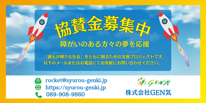 ロケット打ち上げプロジェクトロケット製作・発射体験会ロケット打ち上げ体験GEN気は、「下町ロケット」のモデルとなった『植松電機』様のロケット体験開催のパートナーです。 「夢をあきらめない力」を子どもたちへ 植松電機様「ロケット教室」開催について このたびGEN気は、株式会社植松電機様の「ロケット教室」を開催できる「UEパートナー」となりました。植松電機様は、テレビドラマ『下町ロケット』のモデルにもなった企業であり、「思い描くことができれば、それは実現できる。」「思うは招く。夢があればなんでもできる。」という信念のもと、北海道赤平市で小型ロケットの開発・製造に取り組まれています。 「ロケット教室」は、そんな植松電機様の想いをカタチにした体験型プログラム。子どもたち自身の手でロケットを組み立て、空へと打ち上げる体験を通して、「自分にもできた!」という成功体験と、「夢をあきらめない力」を育むことができます。私たちもまた、この「どうせ無理」という言葉に挑み続ける植松電機様の姿勢に深く共感し、このロケット教室を地域の子どもたちや保護者の皆さまに届けていきたいと考えています。ロケットを通して伝えたいのは、科学の面白さだけではありません。自らの手で何かを作り、挑戦し、やり遂げることの尊さです。未来を担う子どもたちが、自分の可能性を信じるきっかけとなるよう、心を込めて教室を開催してまいります。どうぞご期待ください。 【弊社代表 ごあいさつ】 私たちは、障がいがあっても夢を諦めない社会を目指して、就労支援と教育を通じて「自分らしく生きる力」を育んできました。そして今、新たな挑戦が始まります。それが、「ロケット打ち上げプロジェクト」。参加者が自らの手でロケットを作り、夢を描き、大空へ飛ばす——それは、ただの体験ではありません。自分を信じ、可能性を信じる「きっかけ」を手にする旅です。私たちは、この小さな一歩が、大きな未来への扉になると信じています。誰もが希望を持ち、未来へ羽ばたける社会の実現へ。GEN気グループのロケットに、あなたの想いを乗せてみませんか? 株式会社GEN気 代表取締役 下村俊樹 GEN気 ロケット打ち上げプロジェクト できないと思っていたことも挑戦すれば「出来た」に変わります。株式会社GEN気 代表取締役 下村俊樹「思うは招く」夢を描けば、未来は動き出す。株式会社GEN気 代表取締役 下村俊樹信じる力が、未来を変える。 「夢を、大空へ!」株式会社GEN気 代表取締役 下村俊樹夢や希望を決して諦めない!思うは必ずしや実現します!株式会社GEN気 代表取締役 下村俊樹 【2025年4月29日(祝) ロケット発射体験会 開催レポート】 4月29日(祝)、障がいのある方とその保護者の皆さま、また地域のお子さまを対象とした「ロケット発射体験会(ロケット教室)」を開催いたしました。 【当日のスケジュール】 12:00~12:30 開場・受付(見奈良天然温泉 利楽「梅の間」)12:30~13:00 開会・主催者挨拶/植松努社長 講話(VTR)13:00~14:00 ロケット製作体験・記念撮影14:15~14:30 川内運動場へ移動14:30~15:00 ロケット発射・記念撮影・解散 【ロケット製作】 12時の受付開始とともに、皆さまが笑顔で会場に集まり、和やかな雰囲気の中でイベントがスタートしました。開会にあたっては主催者よりご挨拶をさせていただき、続いて、夢をあきらめない大切さを伝えてくださる植松努社長の講話(VTR)を上映。参加者の皆さまも真剣に耳を傾けていらっしゃいました。 その後のロケット製作体験では、思い思いのデザインや工夫をこらしながら、自分だけのロケット作りに挑戦。保護者の方と協力して作業する姿がとても微笑ましく、完成したロケットを手にしたときの達成感に満ちた表情が印象的でした。完成後は、皆さんで記念撮影も行い、楽しいひとときを共有しました。 出典:愛媛CATV様https://syurou-genki.jp/wp/wp-content/uploads/2025/11/1a9cb1fe409aecf837493109a2e6885c.mp4 【ロケット発射】 製作体験の後は、会場を川内運動場に移し、いよいよロケット発射の時間です。快晴の空へと高く飛んでいくロケットに大きな拍手と歓声が上がり、会場は感動に包まれました。最後には再び記念撮影を行い、笑顔と感動にあふれた一日を締めくくりました。 https://syurou-genki.jp/wp/wp-content/uploads/2025/05/767619962.104986.mp4 【画像ライブラリ】 【メディアへの掲載】 \多くのメディアにご掲載いただきました/各記事をクリックすると大きく表示されます。 出典:愛媛新聞様 出典:愛媛朝日テレビ様 出典:Yahoo!ニュース様 ものづくりの楽しさと、仲間と過ごす時間の大切さを感じられる本イベント。次回も、安心してご参加いただける環境を整えてお待ちしております。どうぞお楽しみに。 【協賛金募集】 【ロケットの仕組み】 ご体験いただくのは、本物と同じ原理!小さいけれど電気信号を送ると発射します。わずか0.3秒で時速200キロを突破し、約40メートルの高さまで飛び上がります。その後、自動でパラシュートが開