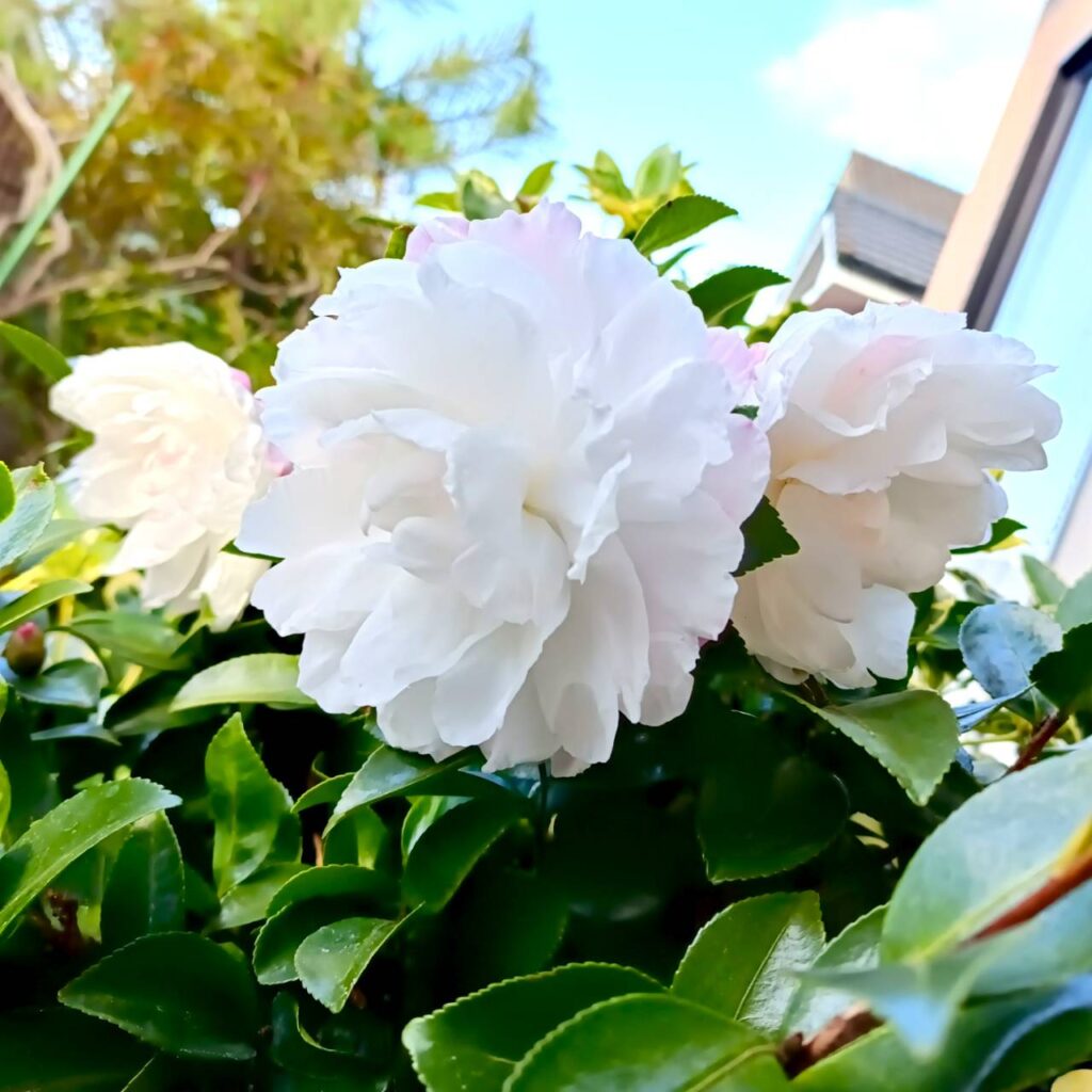 ということは、これは「山茶花」、あるいは山茶花の仲間の「寒椿(カンツバキ)」かもしれませんね。 「寒椿」は名前に「椿」とついていますが、実はサザンカに近い種類なんだそうです。へえー、知りませんでした!
