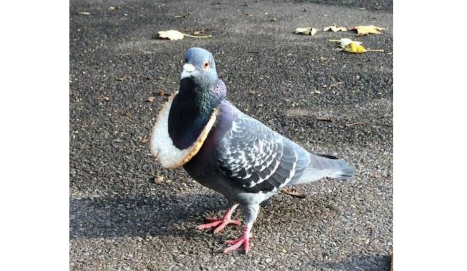 それでも鳩は、白い部分をぎりぎりまで攻めます。そして、何度かつつくうちに反動でバゲットの輪っかが跳ね上がり、ちょうど鳩の首にはまったのです。